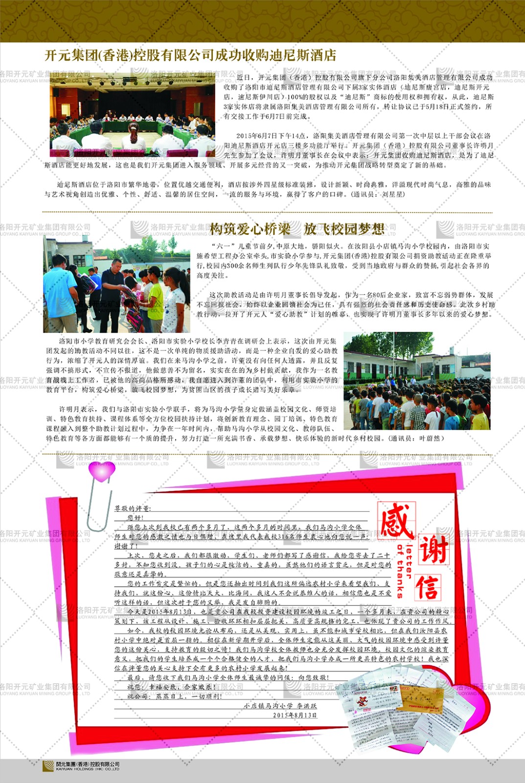洛陽開元礦業(yè)集團有限公司簡介洛陽開元礦業(yè)集團有限公司,始成立于2006年,位于洛陽市開元大道269號。集團旗下共有十余家全資子公司,業(yè)務(wù)涉及有色金屬礦山開發(fā)、礦產(chǎn)品購銷與進出口貿(mào)易、房地產(chǎn)開發(fā)、文化藝術(shù)、企業(yè)管理與咨詢、資本投資等多個領(lǐng)域。2024年,集團公司銷售總額達7.8億元。民建河南省委委員、民建河南省委企業(yè)委副主任、民建洛陽市委委員、企業(yè)委主任、洛陽民建企業(yè)家協(xié)會會長許明月是公司創(chuàng)始人,現(xiàn)任洛陽開元礦業(yè)集團有限公司董事長。在礦業(yè)領(lǐng)域,洛陽開元礦業(yè)集團擁有多家實力雄厚的子公司:貴州開元礦業(yè)有限公司探、采礦權(quán)面積共11.33平方公里;興海縣銅鑫礦業(yè)有限公司探礦權(quán)面積8.76平方公里,礦山資源潛力巨大;2021年,開元集團與盧氏中科礦業(yè)有限公司開展戰(zhàn)略合作。盧氏中科礦業(yè)有限公司專注于有色金屬的浮選、加工和銷售,擁有強大的技術(shù)支撐平臺,是集探、采、選、冶、研為一體的中大型綜合礦業(yè)企業(yè)。目前,盧氏中科王家河1000噸選礦廠已成功投產(chǎn),雙河金礦、柳關(guān)欒盧鉛鋅礦相繼順利開工,樓房銀礦與圪老灣鉛鋅礦的深部探礦重大突破,標志著礦山版圖取得重大進展,為開元集團后續(xù)發(fā)展奠定了堅實基礎(chǔ)。在文化傳媒領(lǐng)域,洛陽市明月美術(shù)館通過豐富多樣的藝術(shù)展覽、學(xué)術(shù)研討和公共教育活動,努力打造一個集展覽、交流、教育、研究為一體的綜合性藝術(shù)平臺。此外,在金融投資領(lǐng)域,開元集團旗下的北京明峰資本管理有限公司專注于投資具有高增長潛力的優(yōu)秀企業(yè),特別是高科技、新能源、環(huán)保等新興產(chǎn)業(yè),為客戶提供個性化的資產(chǎn)配置服務(wù)。在做好企業(yè)經(jīng)營的同時,開元集團始終不忘企業(yè)的社會責任和家國情懷,以突出的愛心公益事跡,開展了一系列公益慈善活動:“民建林”公益事業(yè)通過“思源基金”“幫幫公益”線上公益平臺,與眾多愛心人士籌措資金20余萬元;資助541名貧困大學(xué)生共計270余萬元,推進“數(shù)字助力——河南AI人才培養(yǎng)”;捐款10萬元,馳援京津冀、黑龍江洪水地質(zhì)災(zāi)害……公司于2017年底被洛陽市慈善總會評為“洛陽慈善風云榜——十大愛心集體”。洛陽開元礦業(yè)集團有限公司秉承持續(xù)發(fā)展理念,憑借多年來良好的企業(yè)信譽與經(jīng)營業(yè)績,與全國多家企業(yè)建立了良好合作關(guān)系,受到社會各界的一致好評,多次榮獲“納稅標兵”“先進企業(yè)”“招商引資模范企業(yè)”等榮譽稱號?;赝麃頃r路,開元人勠力同心,以“闖”的精神和“創(chuàng)”的勁頭,一路披荊斬棘,踏過千山萬水;展望新未來,開元人凝心聚力,不執(zhí)于“舊”,無畏于“新”,秉承“勇于跨越,追求卓越”的企業(yè)精神,乘著國家高質(zhì)量發(fā)展新征程的東風,跨過高山,越過大海,向著集團多元化、國際化的目標,逐夢遠航,跨越前行!