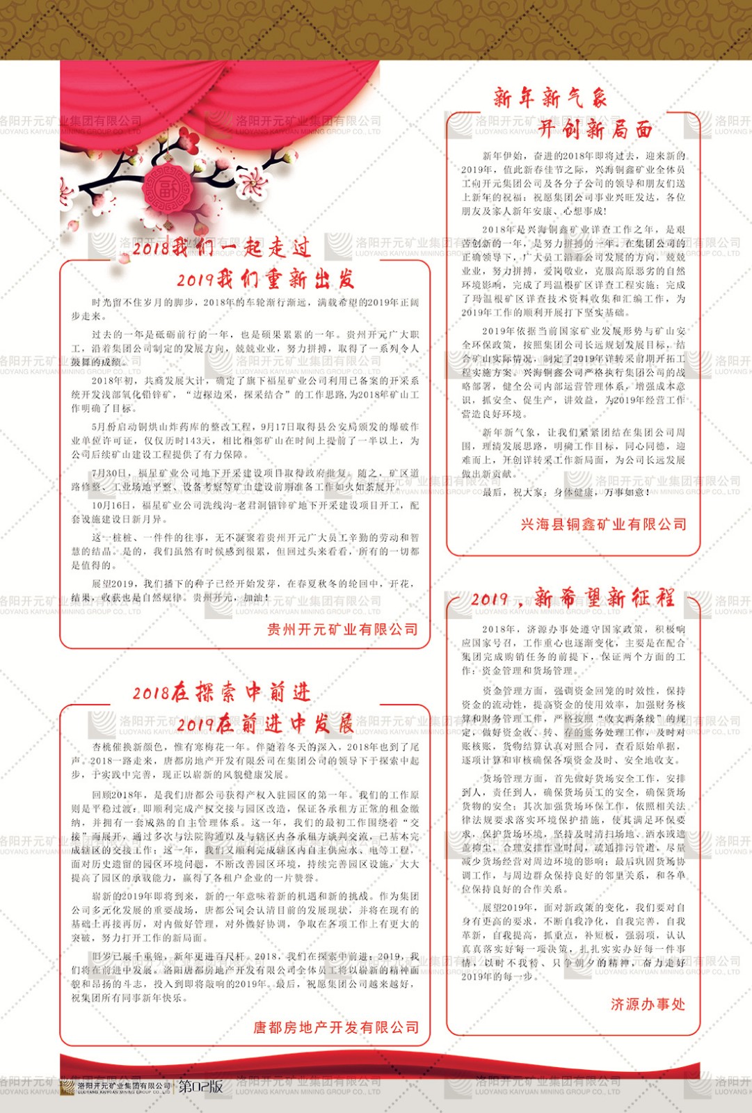 洛陽開元礦業(yè)集團有限公司簡介洛陽開元礦業(yè)集團有限公司,始成立于2006年,位于洛陽市開元大道269號。集團旗下共有十余家全資子公司,業(yè)務涉及有色金屬礦山開發(fā)、礦產品購銷與進出口貿易、房地產開發(fā)、文化藝術、企業(yè)管理與咨詢、資本投資等多個領域。2024年,集團公司銷售總額達7.8億元。民建河南省委委員、民建河南省委企業(yè)委副主任、民建洛陽市委委員、企業(yè)委主任、洛陽民建企業(yè)家協(xié)會會長許明月是公司創(chuàng)始人,現(xiàn)任洛陽開元礦業(yè)集團有限公司董事長。在礦業(yè)領域,洛陽開元礦業(yè)集團擁有多家實力雄厚的子公司:貴州開元礦業(yè)有限公司探、采礦權面積共11.33平方公里;興??h銅鑫礦業(yè)有限公司探礦權面積8.76平方公里,礦山資源潛力巨大;2021年,開元集團與盧氏中科礦業(yè)有限公司開展戰(zhàn)略合作。盧氏中科礦業(yè)有限公司專注于有色金屬的浮選、加工和銷售,擁有強大的技術支撐平臺,是集探、采、選、冶、研為一體的中大型綜合礦業(yè)企業(yè)。目前,盧氏中科王家河1000噸選礦廠已成功投產,雙河金礦、柳關欒盧鉛鋅礦相繼順利開工,樓房銀礦與圪老灣鉛鋅礦的深部探礦重大突破,標志著礦山版圖取得重大進展,為開元集團后續(xù)發(fā)展奠定了堅實基礎。在文化傳媒領域,洛陽市明月美術館通過豐富多樣的藝術展覽、學術研討和公共教育活動,努力打造一個集展覽、交流、教育、研究為一體的綜合性藝術平臺。此外,在金融投資領域,開元集團旗下的北京明峰資本管理有限公司專注于投資具有高增長潛力的優(yōu)秀企業(yè),特別是高科技、新能源、環(huán)保等新興產業(yè),為客戶提供個性化的資產配置服務。在做好企業(yè)經營的同時,開元集團始終不忘企業(yè)的社會責任和家國情懷,以突出的愛心公益事跡,開展了一系列公益慈善活動:“民建林”公益事業(yè)通過“思源基金”“幫幫公益”線上公益平臺,與眾多愛心人士籌措資金20余萬元;資助541名貧困大學生共計270余萬元,推進“數(shù)字助力——河南AI人才培養(yǎng)”;捐款10萬元,馳援京津冀、黑龍江洪水地質災害……公司于2017年底被洛陽市慈善總會評為“洛陽慈善風云榜——十大愛心集體”。洛陽開元礦業(yè)集團有限公司秉承持續(xù)發(fā)展理念,憑借多年來良好的企業(yè)信譽與經營業(yè)績,與全國多家企業(yè)建立了良好合作關系,受到社會各界的一致好評,多次榮獲“納稅標兵”“先進企業(yè)”“招商引資模范企業(yè)”等榮譽稱號?;赝麃頃r路,開元人勠力同心,以“闖”的精神和“創(chuàng)”的勁頭,一路披荊斬棘,踏過千山萬水;展望新未來,開元人凝心聚力,不執(zhí)于“舊”,無畏于“新”,秉承“勇于跨越,追求卓越”的企業(yè)精神,乘著國家高質量發(fā)展新征程的東風,跨過高山,越過大海,向著集團多元化、國際化的目標,逐夢遠航,跨越前行!