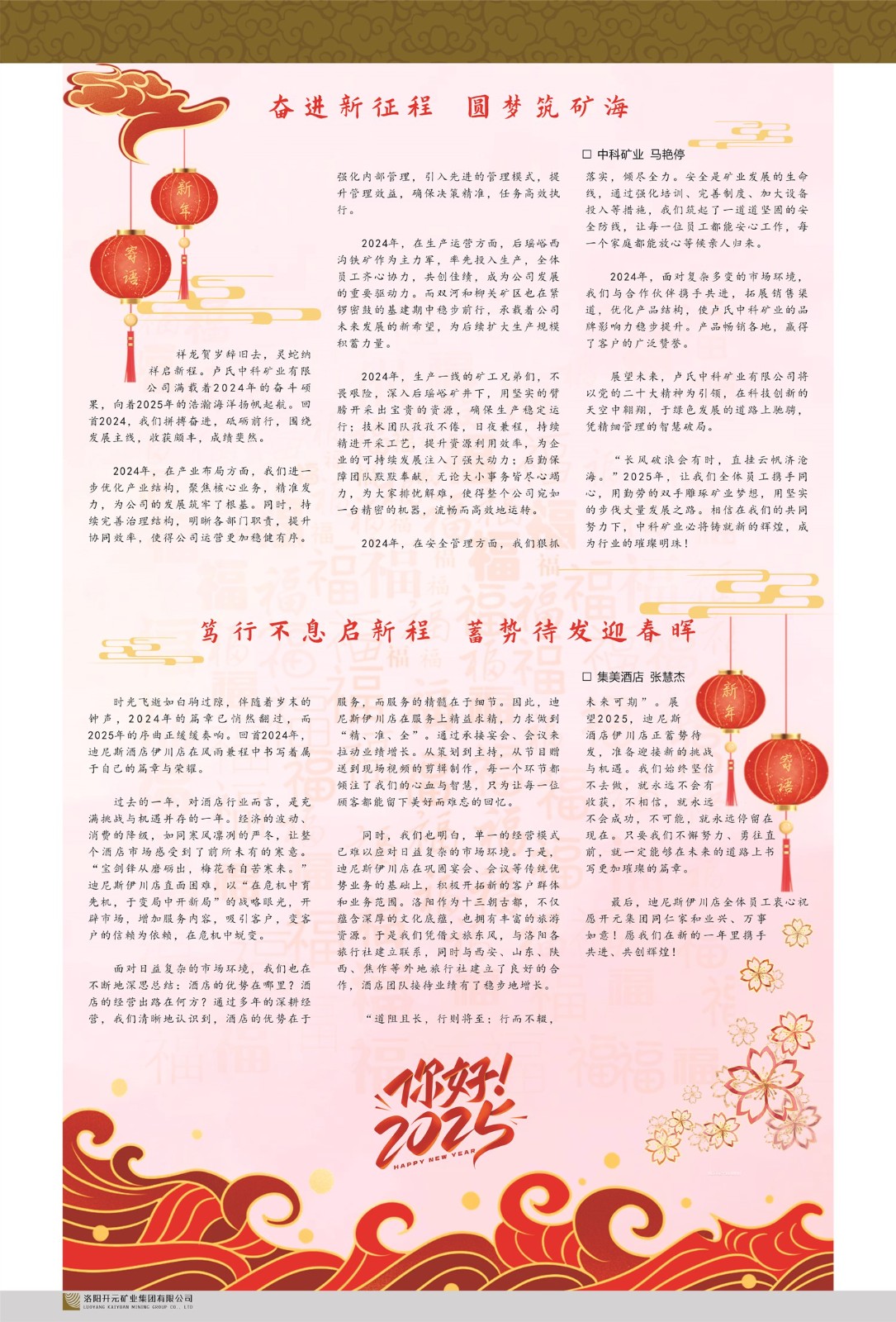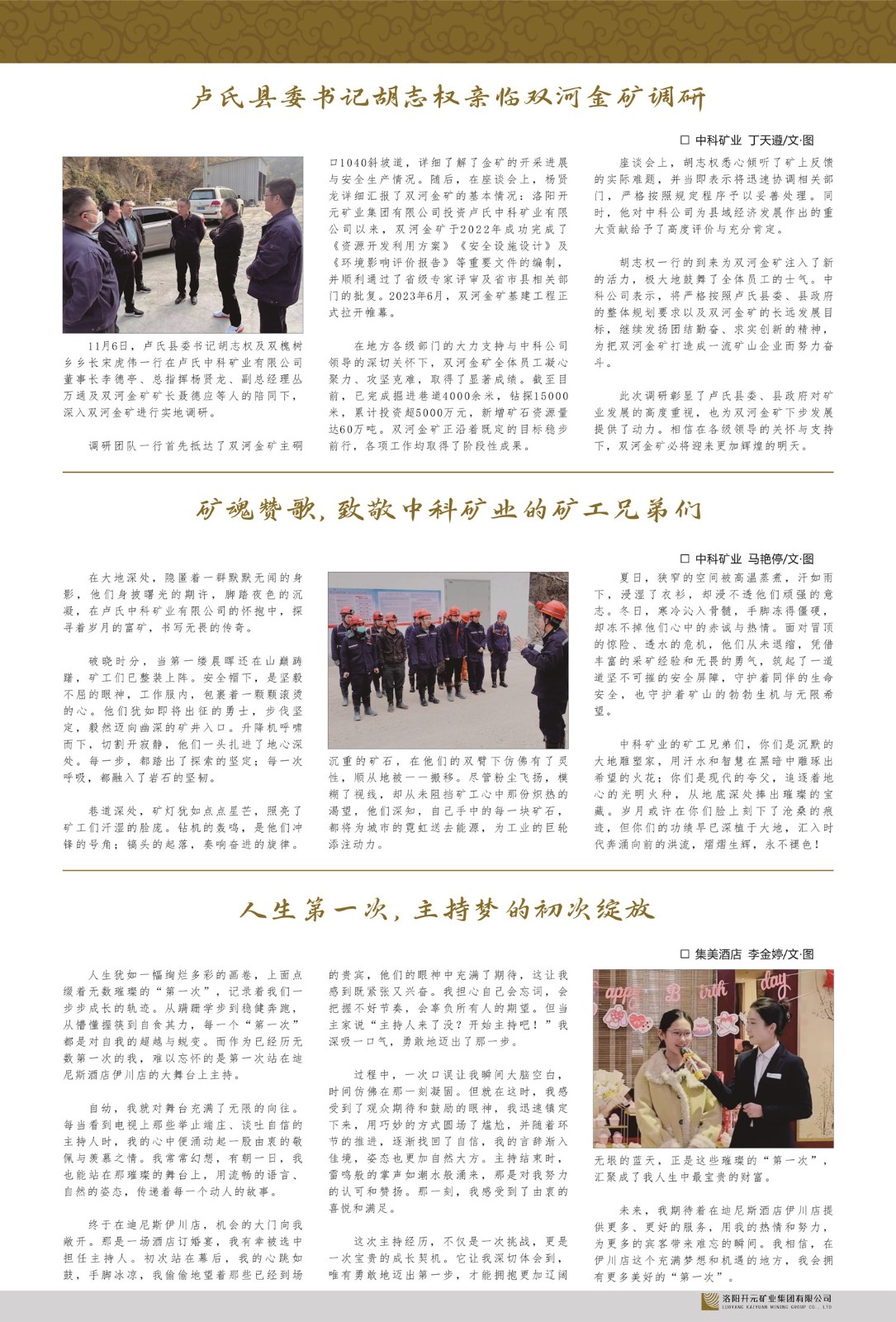 洛陽開元礦業(yè)集團有限公司簡介洛陽開元礦業(yè)集團有限公司,始成立于2006年,位于洛陽市開元大道269號。集團旗下共有十余家全資子公司,業(yè)務(wù)涉及有色金屬礦山開發(fā)、礦產(chǎn)品購銷與進出口貿(mào)易、房地產(chǎn)開發(fā)、文化藝術(shù)、企業(yè)管理與咨詢、資本投資等多個領(lǐng)域。2024年,集團公司銷售總額達7.8億元。民建河南省委委員、民建河南省委企業(yè)委副主任、民建洛陽市委委員、企業(yè)委主任、洛陽民建企業(yè)家協(xié)會會長許明月是公司創(chuàng)始人,現(xiàn)任洛陽開元礦業(yè)集團有限公司董事長。在礦業(yè)領(lǐng)域,洛陽開元礦業(yè)集團擁有多家實力雄厚的子公司:貴州開元礦業(yè)有限公司探、采礦權(quán)面積共11.33平方公里;興海縣銅鑫礦業(yè)有限公司探礦權(quán)面積8.76平方公里,礦山資源潛力巨大;2021年,開元集團與盧氏中科礦業(yè)有限公司開展戰(zhàn)略合作。盧氏中科礦業(yè)有限公司專注于有色金屬的浮選、加工和銷售,擁有強大的技術(shù)支撐平臺,是集探、采、選、冶、研為一體的中大型綜合礦業(yè)企業(yè)。目前,盧氏中科王家河1000噸選礦廠已成功投產(chǎn),雙河金礦、柳關(guān)欒盧鉛鋅礦相繼順利開工,樓房銀礦與圪老灣鉛鋅礦的深部探礦重大突破,標志著礦山版圖取得重大進展,為開元集團后續(xù)發(fā)展奠定了堅實基礎(chǔ)。在文化傳媒領(lǐng)域,洛陽市明月美術(shù)館通過豐富多樣的藝術(shù)展覽、學(xué)術(shù)研討和公共教育活動,努力打造一個集展覽、交流、教育、研究為一體的綜合性藝術(shù)平臺。此外,在金融投資領(lǐng)域,開元集團旗下的北京明峰資本管理有限公司專注于投資具有高增長潛力的優(yōu)秀企業(yè),特別是高科技、新能源、環(huán)保等新興產(chǎn)業(yè),為客戶提供個性化的資產(chǎn)配置服務(wù)。在做好企業(yè)經(jīng)營的同時,開元集團始終不忘企業(yè)的社會責任和家國情懷,以突出的愛心公益事跡,開展了一系列公益慈善活動:“民建林”公益事業(yè)通過“思源基金”“幫幫公益”線上公益平臺,與眾多愛心人士籌措資金20余萬元;資助541名貧困大學(xué)生共計270余萬元,推進“數(shù)字助力——河南AI人才培養(yǎng)”;捐款10萬元,馳援京津冀、黑龍江洪水地質(zhì)災(zāi)害……公司于2017年底被洛陽市慈善總會評為“洛陽慈善風云榜——十大愛心集體”。洛陽開元礦業(yè)集團有限公司秉承持續(xù)發(fā)展理念,憑借多年來良好的企業(yè)信譽與經(jīng)營業(yè)績,與全國多家企業(yè)建立了良好合作關(guān)系,受到社會各界的一致好評,多次榮獲“納稅標兵”“先進企業(yè)”“招商引資模范企業(yè)”等榮譽稱號?;赝麃頃r路,開元人勠力同心,以“闖”的精神和“創(chuàng)”的勁頭,一路披荊斬棘,踏過千山萬水;展望新未來,開元人凝心聚力,不執(zhí)于“舊”,無畏于“新”,秉承“勇于跨越,追求卓越”的企業(yè)精神,乘著國家高質(zhì)量發(fā)展新征程的東風,跨過高山,越過大海,向著集團多元化、國際化的目標,逐夢遠航,跨越前行!