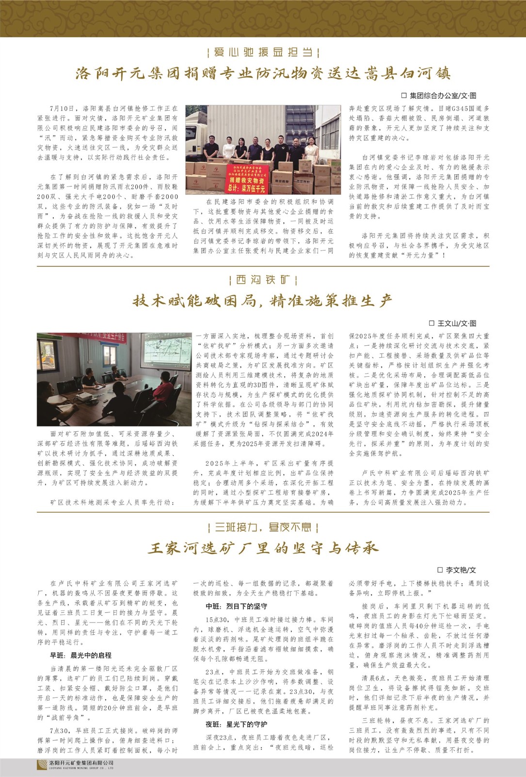洛陽開元礦業(yè)集團有限公司簡介洛陽開元礦業(yè)集團有限公司,始成立于2006年,位于洛陽市開元大道269號。集團旗下共有十余家全資子公司,業(yè)務(wù)涉及有色金屬礦山開發(fā)、礦產(chǎn)品購銷與進出口貿(mào)易、房地產(chǎn)開發(fā)、文化藝術(shù)、企業(yè)管理與咨詢、資本投資等多個領(lǐng)域。2024年,集團公司銷售總額達7.8億元。民建河南省委委員、民建河南省委企業(yè)委副主任、民建洛陽市委委員、企業(yè)委主任、洛陽民建企業(yè)家協(xié)會會長許明月是公司創(chuàng)始人,現(xiàn)任洛陽開元礦業(yè)集團有限公司董事長。在礦業(yè)領(lǐng)域,洛陽開元礦業(yè)集團擁有多家實力雄厚的子公司:貴州開元礦業(yè)有限公司探、采礦權(quán)面積共11.33平方公里;興??h銅鑫礦業(yè)有限公司探礦權(quán)面積8.76平方公里,礦山資源潛力巨大;2021年,開元集團與盧氏中科礦業(yè)有限公司開展戰(zhàn)略合作。盧氏中科礦業(yè)有限公司專注于有色金屬的浮選、加工和銷售,擁有強大的技術(shù)支撐平臺,是集探、采、選、冶、研為一體的中大型綜合礦業(yè)企業(yè)。目前,盧氏中科王家河1000噸選礦廠已成功投產(chǎn),雙河金礦、柳關(guān)欒盧鉛鋅礦相繼順利開工,樓房銀礦與圪老灣鉛鋅礦的深部探礦重大突破,標志著礦山版圖取得重大進展,為開元集團后續(xù)發(fā)展奠定了堅實基礎(chǔ)。在文化傳媒領(lǐng)域,洛陽市明月美術(shù)館通過豐富多樣的藝術(shù)展覽、學(xué)術(shù)研討和公共教育活動,努力打造一個集展覽、交流、教育、研究為一體的綜合性藝術(shù)平臺。此外,在金融投資領(lǐng)域,開元集團旗下的北京明峰資本管理有限公司專注于投資具有高增長潛力的優(yōu)秀企業(yè),特別是高科技、新能源、環(huán)保等新興產(chǎn)業(yè),為客戶提供個性化的資產(chǎn)配置服務(wù)。在做好企業(yè)經(jīng)營的同時,開元集團始終不忘企業(yè)的社會責任和家國情懷,以突出的愛心公益事跡,開展了一系列公益慈善活動:“民建林”公益事業(yè)通過“思源基金”“幫幫公益”線上公益平臺,與眾多愛心人士籌措資金20余萬元;資助541名貧困大學(xué)生共計270余萬元,推進“數(shù)字助力——河南AI人才培養(yǎng)”;捐款10萬元,馳援京津冀、黑龍江洪水地質(zhì)災(zāi)害……公司于2017年底被洛陽市慈善總會評為“洛陽慈善風云榜——十大愛心集體”。洛陽開元礦業(yè)集團有限公司秉承持續(xù)發(fā)展理念,憑借多年來良好的企業(yè)信譽與經(jīng)營業(yè)績,與全國多家企業(yè)建立了良好合作關(guān)系,受到社會各界的一致好評,多次榮獲“納稅標兵”“先進企業(yè)”“招商引資模范企業(yè)”等榮譽稱號。回望來時路,開元人勠力同心,以“闖”的精神和“創(chuàng)”的勁頭,一路披荊斬棘,踏過千山萬水;展望新未來,開元人凝心聚力,不執(zhí)于“舊”,無畏于“新”,秉承“勇于跨越,追求卓越”的企業(yè)精神,乘著國家高質(zhì)量發(fā)展新征程的東風,跨過高山,越過大海,向著集團多元化、國際化的目標,逐夢遠航,跨越前行!